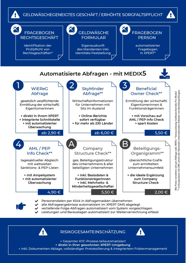 Da der KYC Prozess bis dato von vielen Einzelschritten und unterschiedlichsten Plattformen geprägt war, haben wir dies für Sie geändert und angelehnt an die Best Practice Empfehlung der RAK Wien durch die Integration von WiEReG und CRIF die Möglichkeit geschaffen, den kompletten Workflow in einer Maske zu realisieren. Zudem werden Sie durch intelligente Folgeabfragen von MEDIX5 teilautomatisiert unterstützt. MEDIX5 ermöglicht es Ihnen somit den KYC Prozess rasch & rechtssicher abzubilden und zusätzlich auch noch automatisch zu verrechnen.