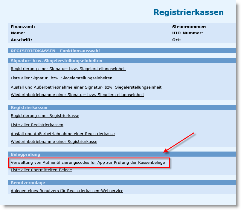 Authentifizierungscode, den Sie bei der Anmeldung Ihrer Registrierkasse über FinanzOnline