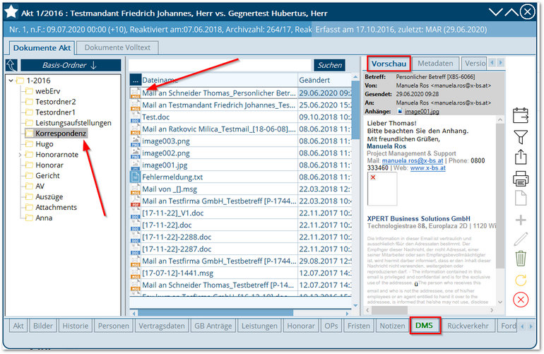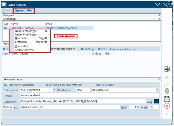 Dateiname/Dokumentordner: Aus allen Bereichen der möglichen Emailversendung besteht durch nachträgliches Eintragen von Empfänger-Personen die Generierung des Leistungstextes und des Dateinamens (wenn z.B. eine Mail aus dem Dokumentenarchiv versendet wird). Die Konfigurationseinstellungen müssten entsprechend gesetzt sein.