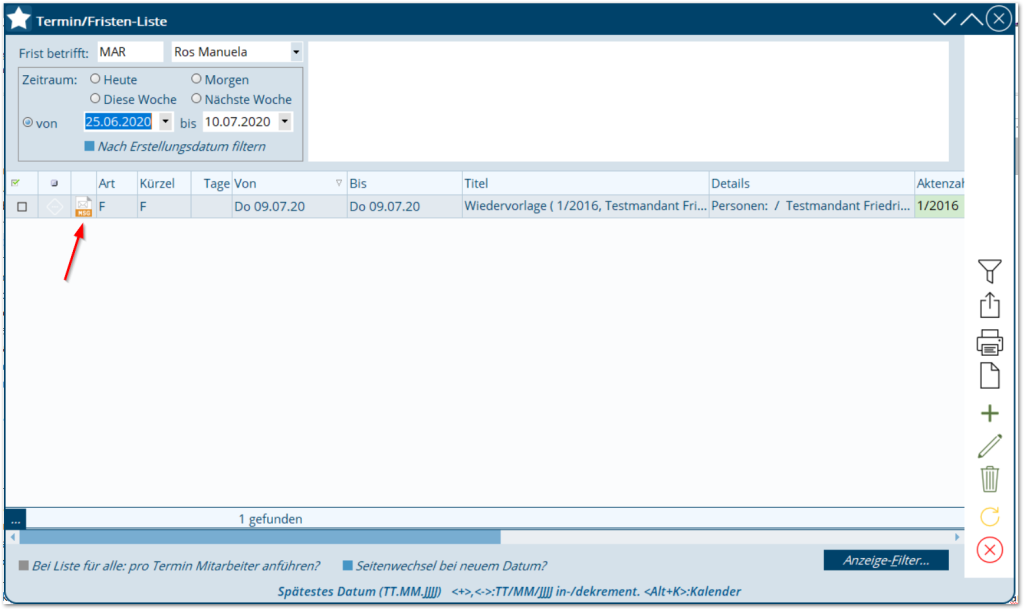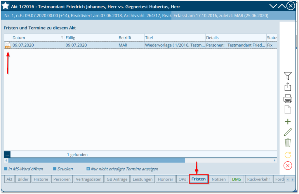 Ist die Checkbox Frist erfassen selektiert, wird das versendete E-Mail nun zusätzlich direkt mit der erfassten Frist verknüpft und ist dadurch sowohl im Akt als auch in der Fristenliste ersichtlich und kann hier einfach und schnell mit Doppelklick geöffnet werden: