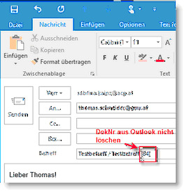 Sodann wird nach Bestätigen der Maske mit dem Häkchen ein Outlook-Mail erstellt. Je nach Konfigurationseinstellung ist, spätestens im Outlook-Emailbetreff, nun eine Dokumentnummer (DokNr) ergänzt, welche nicht zu löschen ist, da dann die Rückschreibung der Daten für die Nachverfolgung nicht mehr funktionieren kann!