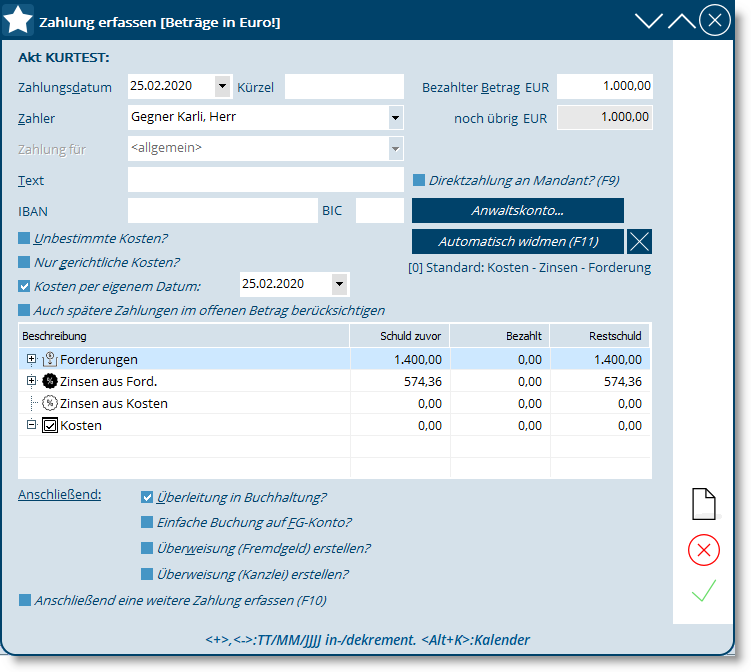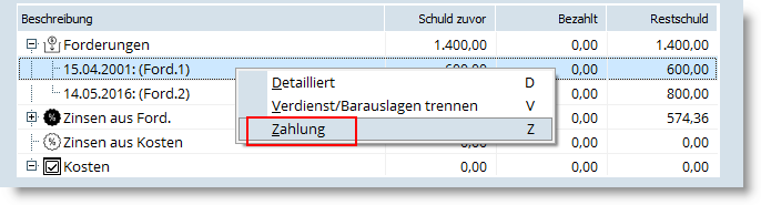 Wichtig ist die Eingabe des Zahlungsdatums, da sich daraus die Zinsen aus der Forderung